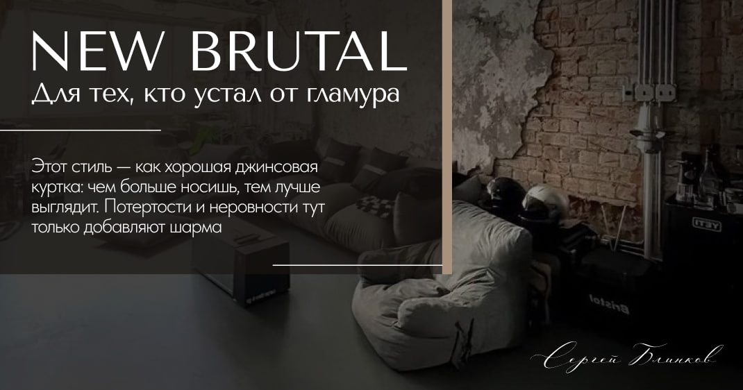 New Brutal — это манифест против искусственной утончённости, навязчивого уюта и интерьеров, которые словно сошли со страниц глянцевых журналов. Здесь нет места притворству — только честные материалы, индустриальная эстетика и бескомпромиссная функциональность. New Brutal — наследник брутализма XX века, но без его социалистического пафоса. Это интерьер для тех, кто ценит: ✔ Правду материалов — бетон есть бетон, металл есть металл. ✔ Функцию над формой — ничего лишнего, только необходимое. ✔ Свободу от декора — красота в фактуре, а не в позолоте. Не просто серая стена, а главный акцент интерьера. Важно: бетон не должен выглядеть «грязным» — только намеренно необработанным. Трубы, вентиляция, провода — не прячем, а выставляем напоказ. Никакого хрома и глянца — только естественные следы времени. 1️⃣ Бунтарям, которые устали от «идеальных» интерьеров. 2️⃣ Прагматикам, которые не хотят переплачивать за декор. 3️⃣ Экспериментаторам, готовым к смелым решениям. ❌ Дешёвых имитаций (пластик «под