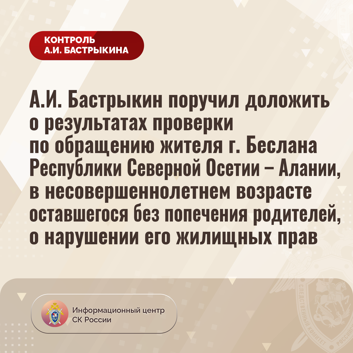 А.И. Бастрыкин поручил доложить о результатах проверки по обращению жителя г. Беслана Республики Северной Осетии – Алании, в несовершеннолетнем возрасте оставшегося без попечения родителей, о нарушении его жилищных прав В Информационный центр СК России обратился житель города Беслана Республики Северной Осетии – Алании, в несовершеннолетнем возрасте оставшийся без попечения родителей, по вопросу длительного непредоставления ему положенного по закону жилья. В 2013 году мужчина принят на учет лиц, подлежащих обеспечению жильем, однако до настоящего времени мер к реализации его прав не принято. В результате заявитель вынужден арендовать квартиру, что для него финансово затруднительно. Многочисленные обращения в компетентные органы результатов не принесли. В региональном следственном управлении по поступившему обращению начата процессуальная проверка. Председатель Следственного комитета Российской Федерации Александр Иванович Бастрыкин поручил руководителю СУ СК России по Республике Северн