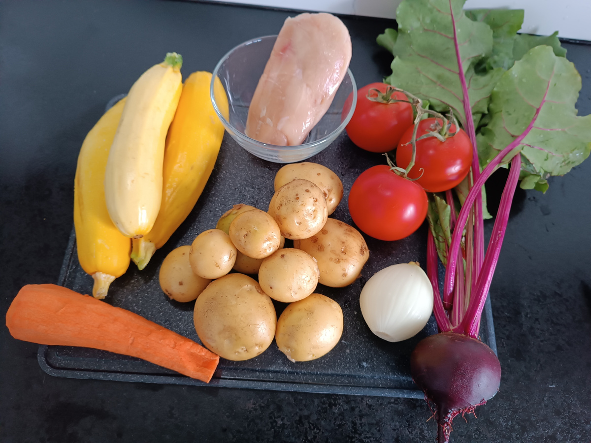 Здравствуйте, дорогие друзья! В разгаре лето, поэтому хочется приготовить что-то яркое и вкусное, но чтобы не очень дорогое. Поэтому предлагаю приготовить «Суп-рагу «Лето на хуторе». Продукты для него нужны недорогие, а результат всегда порадует. Готовим, как обычно Нам понадобятся: Куриное филе – 1-2 шт., Картофель, Кабачки, Свекла, Морковь, Лук репчатый, Помидоры, Соль, перец, растительное масло. Овощи можете изменять в зависимости от ваших вкусовых предпочтений. Но у меня сегодня такой набор. Филе режем на небольшие кусочки и ставим вариться. У свеклы удаляем черешки с листьями, корнеплод чистим и натираем на терке. Морковь измельчаем тоже на терке, лук режем мелким кубиком. Все это обжариваем на растительном масле до мягкости и легкого колера, добавляем нарезанные мелкими кубиками помидоры. Добавляем соль, перец, любимые приправы (у меня «хмели-сунели») и тушим на небольшом огне. Если помидоры кисловатые, добавьте ½ ч.л. сахара. Картофель очищаем, режем кубиком и отправляем в бульо