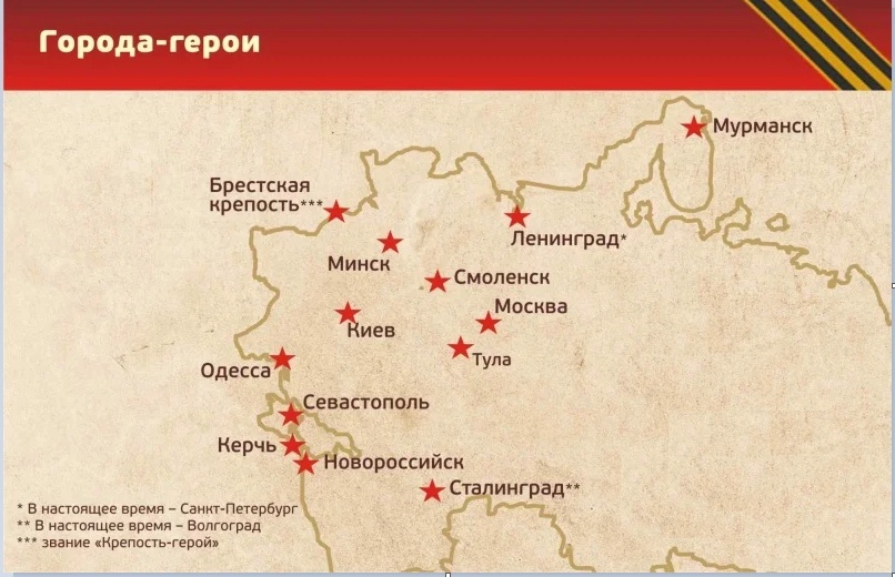 С началом Великой Отечественной термин «Город-герой» прочно вошел в обиход и активно применялся в агитации и публицистике. Правда, в отличие от довоенной практики, использовался он только по отношению к Ленинграду (ныне – Санкт-Петербург), Севастополю, Сталинграду (ныне – Волгоград), Одессе и реже – Москве. Первое упоминание нескольких городов-героев в одном тексте относится к 25 ноября 1942-го, когда в газете «Правда» был опубликован редакционный лозунг-призыв: «Воины Красной Армии! К вам обращены сердца всех советских людей, взоры всего свободолюбивого человечества. К новым подвигам зовет вас бессмертная слава доблестных защитников городов-героев – Ленинграда, Одессы, Севастополя, Сталинграда».