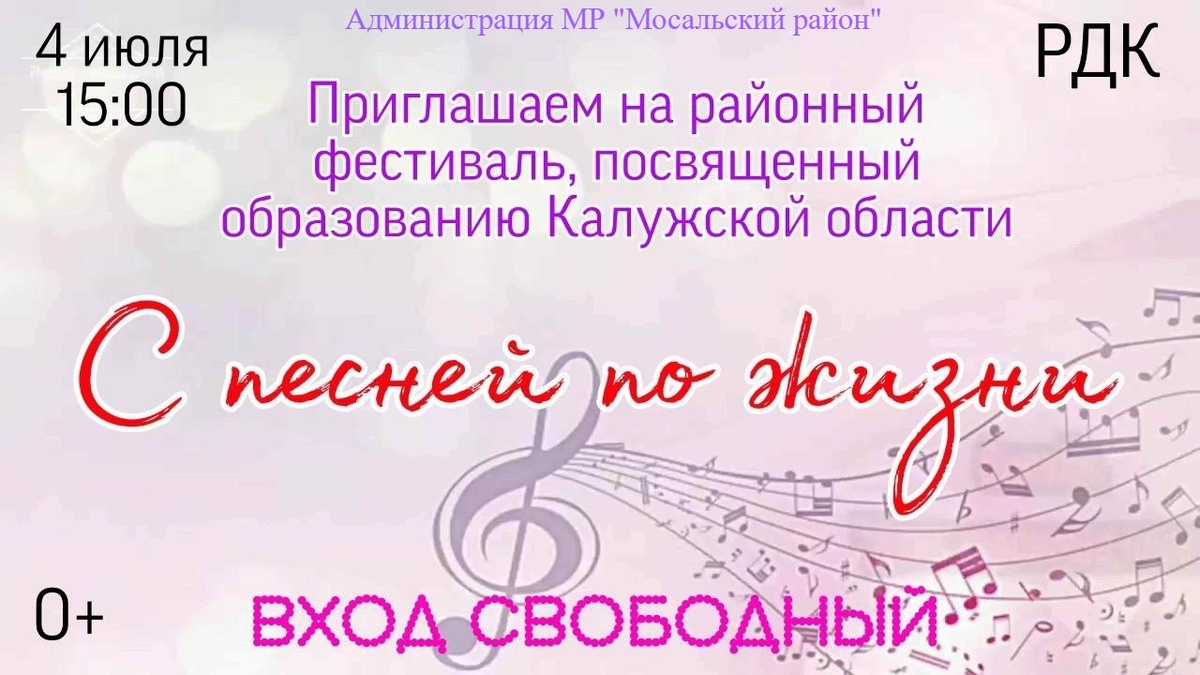 🎈 Приглашают всех на районный фестиваль, посвященный образованию Калужской области «С песней по жизни!» 🔹ДАТА : 4 июля 🔹ВРЕМЯ: 15:00 🔹МЕСТО: Районный Дом культуры #АдминистрацияМРМосальскийРайон