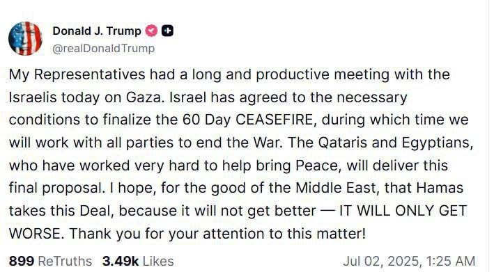 Трамп написал, что Израиль согласился на 60-дневное перемирие в Секторе Газа
