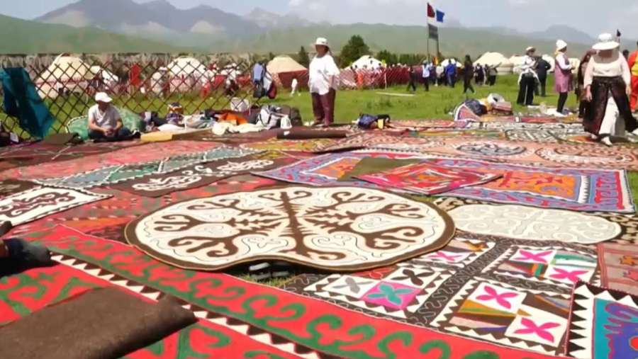 На этом пастбище в Нарынской области царила особая атмосфера. Под звуки народной музыки участники мероприятия в национальных костюмах расстилали на земле традиционные полотна. Главным атрибутом культурного события стали ширдаки. Так кыргызы называют войлочные ковры. Такие изделия издревле были необходимыми предметами быта.