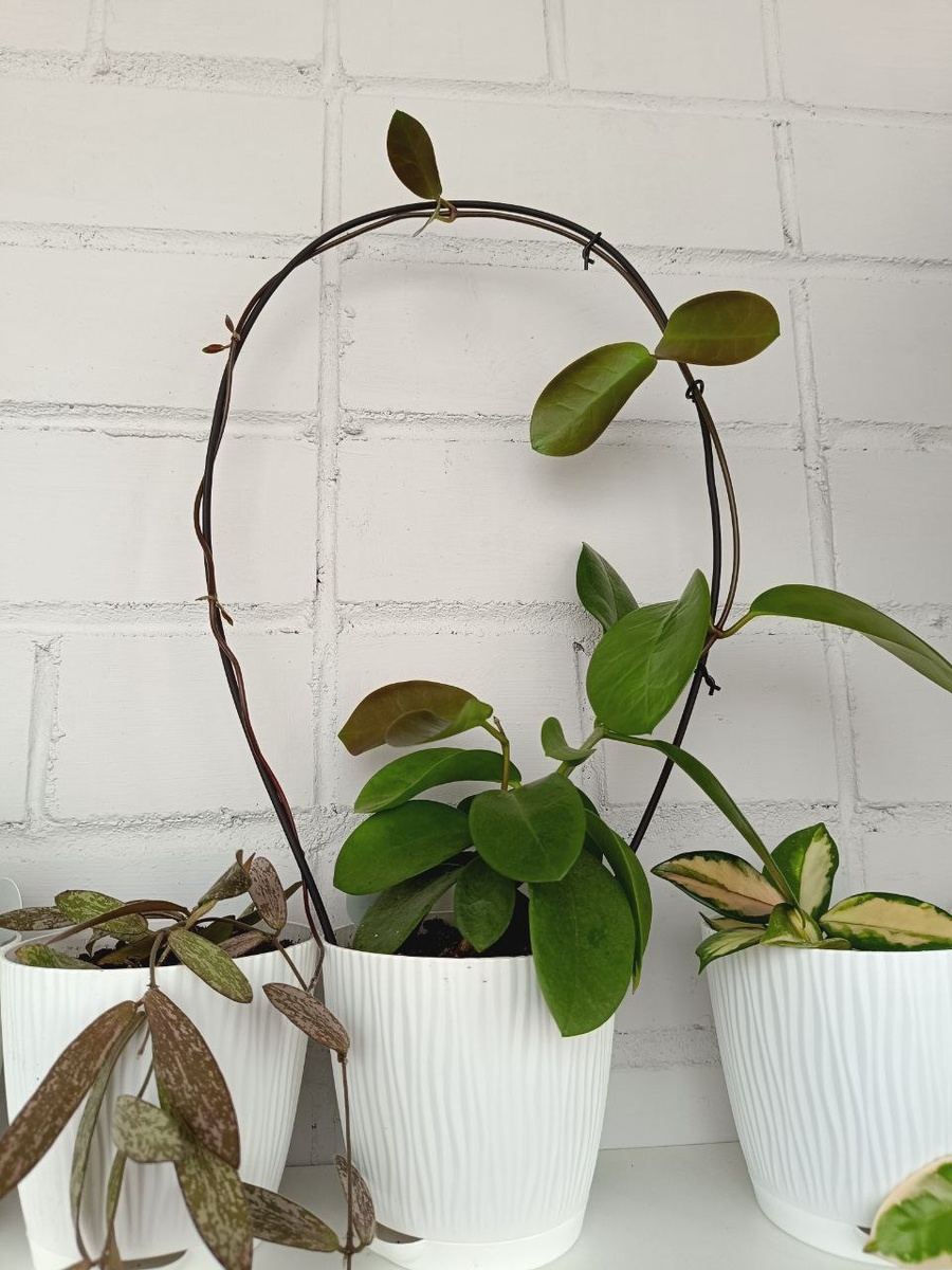 Хойя австралис и начало бешеного роста Хойя австралис появилась у меня пару лет назад в виде маленького черенка. И два года она стояла маленькая, скромненькая и никого не трогала. Даст пару новых листиков, а я и рада. И вот Астапа понесло, как говорится. Очнулась она от какого-то сна и ринулась в рост. Пара недель и хойя австралис увеличила свой размер в несколько раз. Если честно, то я не успевала уже за ней. Пока я выбрала и заказала опору для хойи австралис, она спокойненько сама себе нашла опору. Начала оплетать по соседству висящую хойю карноза. Я уже с нетерпением начала ждать опору, так как боялась, что я потом просто ее не распутаю. Опора приехала, сделала нужную мне дугу и теперь эта дама будет расти и формироваться именно этой дуге. Опора очень хорошая, плотная, хорошо гнется и можно сделать нужную форму. В комплекте идет маленькие крепления, которыми можно фиксировать растение. Планирую еще несколько таких опор заказать для других растений. Размеры есть разные: от 100 см д