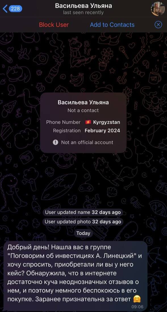 ❗️СКАМ Пожалуйста, будьте максимально внимательны и осторожны. Сейчас активно распространяются две схемы обмана: 1️⃣ Мошенники начинают диалог с безобидных вопросов, а затем предлагают купить поддельные продукты или доступы. 2️⃣ Вам может прийти сообщение якобы от моего имени — с предложениями или просьбами. Но я никогда первым не пишу в личные сообщения. Если у вас возникают сомнения — обязательно проверьте информацию у моих помощников: @aleksacz и @an_buterus ❗️Не переводите деньги, не переходите по сомнительным ссылкам, не передавайте личные данные. Берегите себя и свои финансы. 🖼Алексей Линецкий | 🔗Сайт 📹Youtube | 📹Rutube 🔒Закрытый клуб | 🎧Подкасты