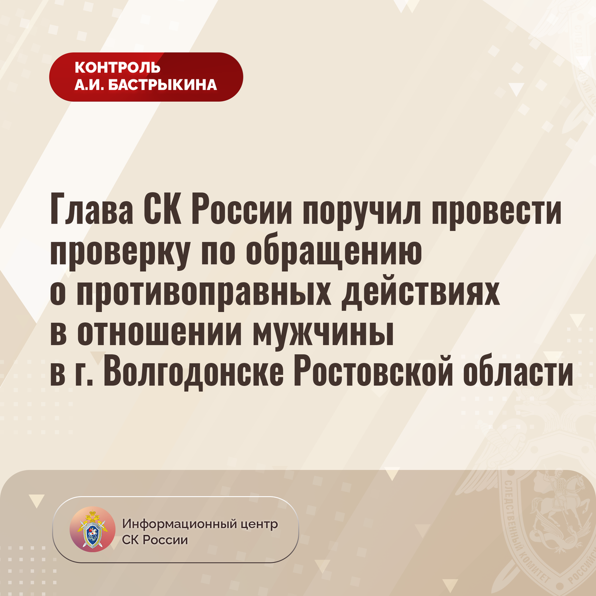 Глава СК России поручил провести проверку по обращению о противоправных действиях в отношении мужчины в г. Волгодонске Ростовской области