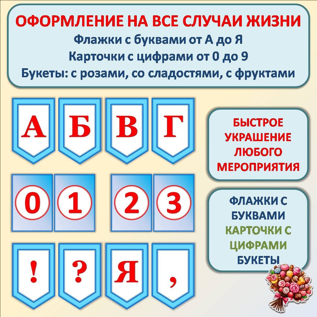 Вам необходимо быстро украсить своё мероприятие? Данные флажки с буквами от А до Я и карточки с цифрами от 0 до 9 станут прекрасным дополнением для проведения классных, внеклассных мероприятий, а также украшения класса или стенда в рекреации. Прекрасно подойдут и для оформления семейного мероприятия, ведь из них можно составить любое имя члена семьи. Карточки с цифрами пригодятся, если нужно обозначить памятную дату или возраст именинника. Специально подобранный нейтральный голубой тон окантовки флажков подойдет к любой тематике мероприятия. Красные буквы и цифры на белом фоне привлекут внимание присутствующих. На флажках имеются все буквы алфавита. Кроме букв, есть знаки пунктуации: точка, восклицательный знак, вопросительный знак, многоточие, запятая. На карточках вы найдете цифры от 0 до 9. Возможно, вам понадобятся букеты для украшения. В данной разработке их три: с розами, со сладостями, с фруктами. Изначально ориентация листов с флажками и цифрами «книжная», флажки и цифры доста