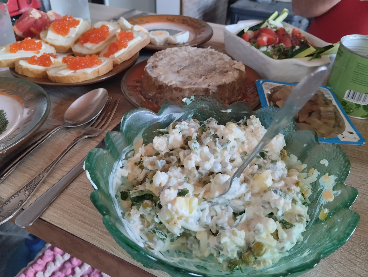 Привет, друзья! Вчера был первый день второго месяца лета, 1 июля а это значит, что до Нового, 2026 года осталось ровно полгода,🥳😁 Как говорится звёзды сошлись - меня накануне угостили красной икрой и красной рыбой с Севера и ещё банкой очень вкусных маринованных огурцов. По этому поводу я решила устроить праздничный обед-ужин вчера, 1 июля под названием "Полгода до Нового года". И вот, что у меня получилось. Купила студень, приготовила салат "Зимний" с летними нотками , ещё была икра, которую не сравнить с тем, что в наших магазинах продают. В магазинах всегда "сопливая", а тут икринка к икринке, просто праздник какой-то на столе 😁🥳 Состав моего "Зимне-летнего" салата такой: *Отварная курица *Яйца *Огурец маринованный *Огурец свежий *Горошек * Зелень с моего смешного города, в том числе лисья редиса *Лук зелёный и репчатый *Сметана и немного майонеза🤭 Я очень редко делаю оливье, вроде как на НГ по традиции делала в этом году, уж и не помню. Ну а ДМ подобную "мешанину