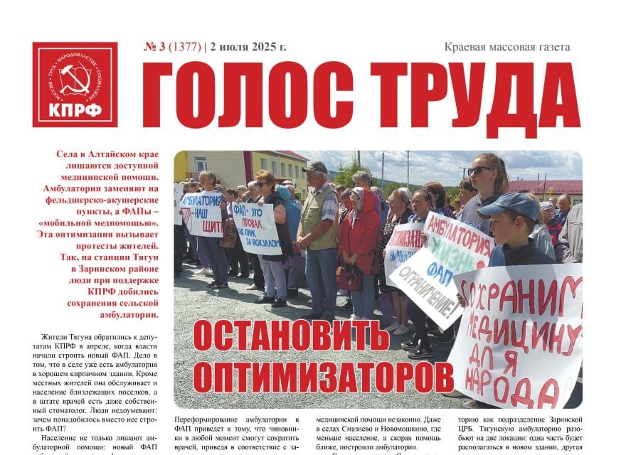 🔴О борьбе с оптимизацией медицины на Алтае: как жителям станции Тягун в Заринском районе при поддержке КПРФ удалось отстоять местную амбулаторию, а село Пятков Лог в Волчихинском районе поднялось на защиту местного ФАПа (стр. 1 и 4).