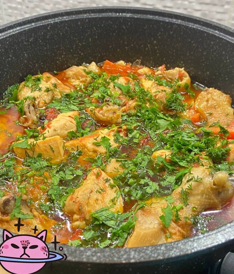 Здравствуйте! Сегодня я хочу поделиться с вами рецептом приготовления вкусной курицы. Это блюдо готовится быстро и легко, а все необходимые ингредиенты всегда есть под рукой. Для начала я нарезала курицу порционными кусочками и обжарила её на смеси растительного и сливочного масла. Затем добавила лук, нарезанный полукольцами, морковь, нарезанную соломкой, болгарский перец, нарезанный соломкой, и мелко нарезанный чеснок. Также я добавила соль, чёрный молотый перец и аджику. После того как овощи и мясо обжарились, я добавила стакан домашнего томатного сока и тушила на медленном огне до готовности. За 10 минут до окончания приготовления я добавила ещё немного чеснока, пропущенного через пресс, а в конце — зелень: петрушку, укроп и кинзу по желанию. Всем приятного аппетита.