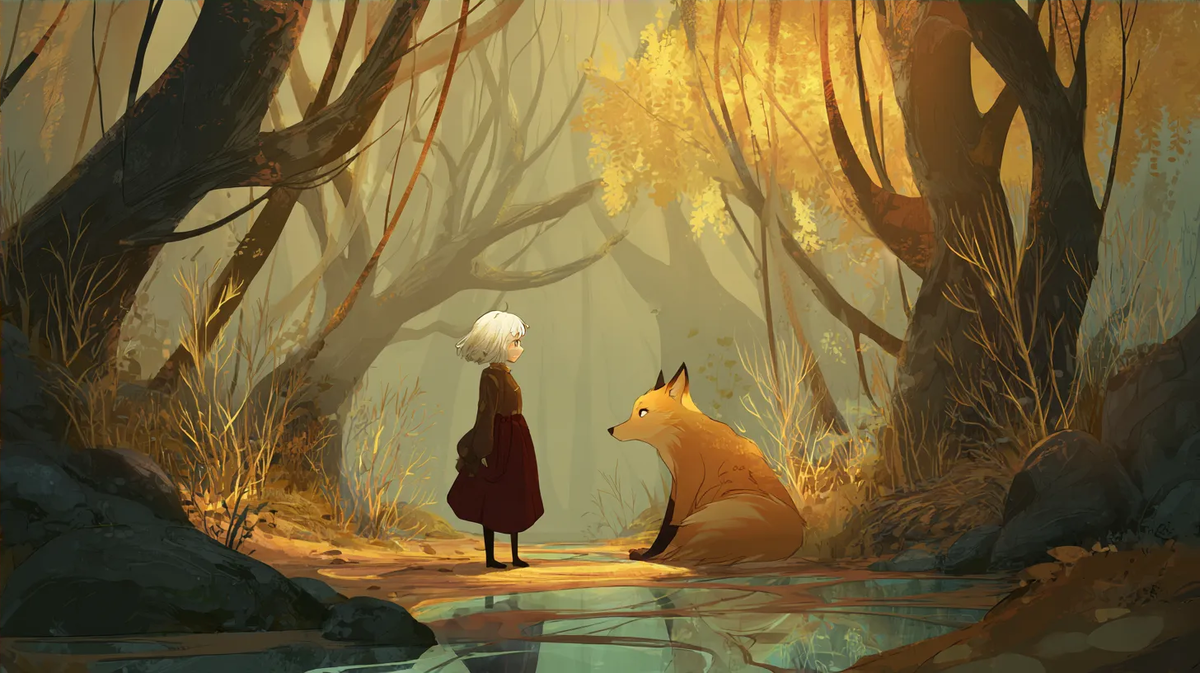 Дорога за дверью в корнях вишнёвого дерева вела Ладу всё глубже в лес. Он был странным. Не страшным, нет — но будто живым. Каждое дерево здесь было зеркалом, но отражало не тело, а мысли. Одна Лада — грустная, в другой — она смеялась, в третьей — держала чью-то ладонь. Она замедлили шаг, оглядываясь... И вдруг — замерла. Прямо на тропинке перед ней сидел Лис. Он был больший, чем обычный — почти как волк. Его шерсть отливала не рыжим, а глубоким тёмным золотом, будто лист в последний день осени. Глаза светились — не злобой, не лаской, а вопросом. Он смотрел на неё внимательно. Слишком внимательно. — Кто ты? — прошептала Лада. Лис наклонил голову. Губ не раскрыл, но слова зазвучали — прямо у неё внутри. Тихо. Чётка. — Что легче воздуха, но тяжелее молчания? Лада замерла. Она вспомнила, как вчера боялась сказать правду, и как одно слово может сделать страшно или светло. — Слово, — ответила она. Лис моргнул один раз — и исчез. Как будто не сидел на тропинке. Она пошла дальше. И снова — дру