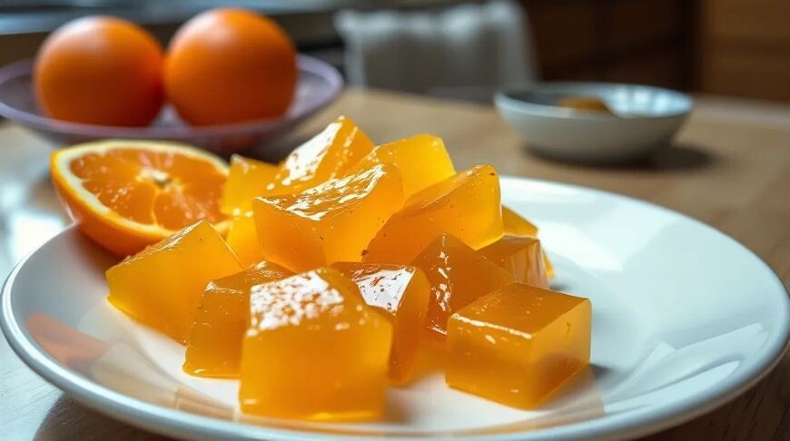 Апельсиновый десерт идеально подойдет для любого случая, придав вашему столу нотки свежести и аромата цитрусов. Ингредиенты: апельсин – 1 шт.; сахар – 100 г; агаровый порошок – 1 ч. л.; сахарная пудра – для посыпки. Приготовление Тщательно помойте апельсин и снимите с него цедру. Затем выжмите сок из апельсина, стараясь удалить косточки. В небольшой кастрюле смешайте апельсиновый сок с сахаром и добавьте агаровый порошок. Хорошо перемешайте, чтобы избежать комочков. Поставьте кастрюлю на средний огонь и доведите смесь до кипения, постоянно помешивая. После закипания убавьте огонь и варите в течение 2–3 мин, продолжая перемешивать. Перелейте горячую смесь в небольшую форму, смазанную растительным маслом, и дайте ей полностью остыть и застыть. Подача Нарежьте застывший десерт на порционные куски. Перед подачей посыпьте каждый кусочек сахарной пудрой, чтобы добавить изящества.