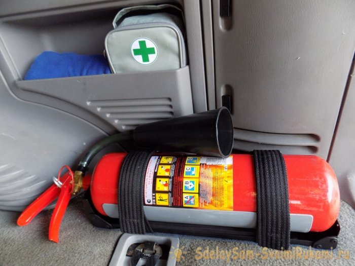 Согласно ПДД, огнетушитель должен быть в каждом автомобиле. Следующий нормативный акт: «Свод Правил СП 9.13130.2009», определяет объем этого прибора (для легковых автомобилей 2 л) и тип (порошковый либо углекислотный). В этом же документе определен порядок размещения средств пожаротушения. Цитировать не будем, основные позиции следующие: