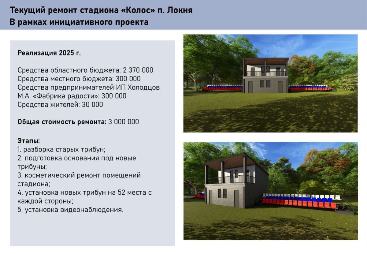 Благоустройство стадиона "Колос" продолжается в Локне. Об этом на своей официальной странице в социальной сети "ВКонтакте" сообщил глава муниципального округа Иван Белугин. Разобраны и вывезены трибуны, которые не подлежали восстановлению. Выровнена площадка под ними. Состоялась аукционная процедура по выбору подрядчика, которому предстоит залить бетонные плиты по обе стороны от подтрибунных помещений. Позже на них установят трибуны по 52 места с каждой стороны. Параллельно готовится и аукционная документация для закупки самих трибун. Как только бетон "наберёт силу", подрядчики приступят к их установке. Иван Белугин рассказал, что ещё предусмотрен небольшой косметический ремонт как внутри помещений, так и снаружи стадиона, закупка спортинвентаря. Ремонт стадиона – это инициативный проект, который был заявлен футбольной командой Локни. Иван Белугин отметил, что один из ТОСов в этом году выиграл проект на освещение стадиона. Все работы планируют завершить в августе. Фото: Иван Белуг