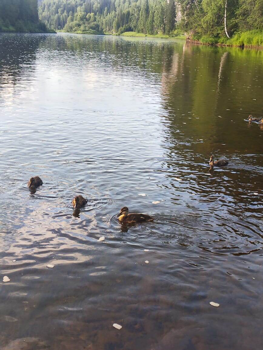 🏞 В июне, когда лето вступает в свои права, Усьва оживает и покрывается разнообразной водной и прибрежной флорой и фауной. Особое внимание в это время привлекают многочисленные пернатые обитатели реки, среди которых можно выделить уток, которые плавают, ныряют и создают неповторимую живую картину природы. 🦆 Утки — одни из самых распространенных водоплавающих птиц в российских реках, и Усьва не исключение. Эти птицы обладают удивительной грацией и легкостью движений, которые особенно заметны в летние дни, когда солнечный свет играет на переливающейся поверхности воды. В июне, когда вода прогревается, а кормовая база становится более доступной, утки активно проводят время на реке. Их деятельность заключается в поисках пищи. Птицы медленно скользят по воде, иногда погружаясь с головой под воду, чтобы выловить водных насекомых, личинок, мелкую рыбу и водные растения. 🐛 Июнь для уток на Усьве — это период активной жизнедеятельности и ухода за потомством. Многие виды уток в это время уж