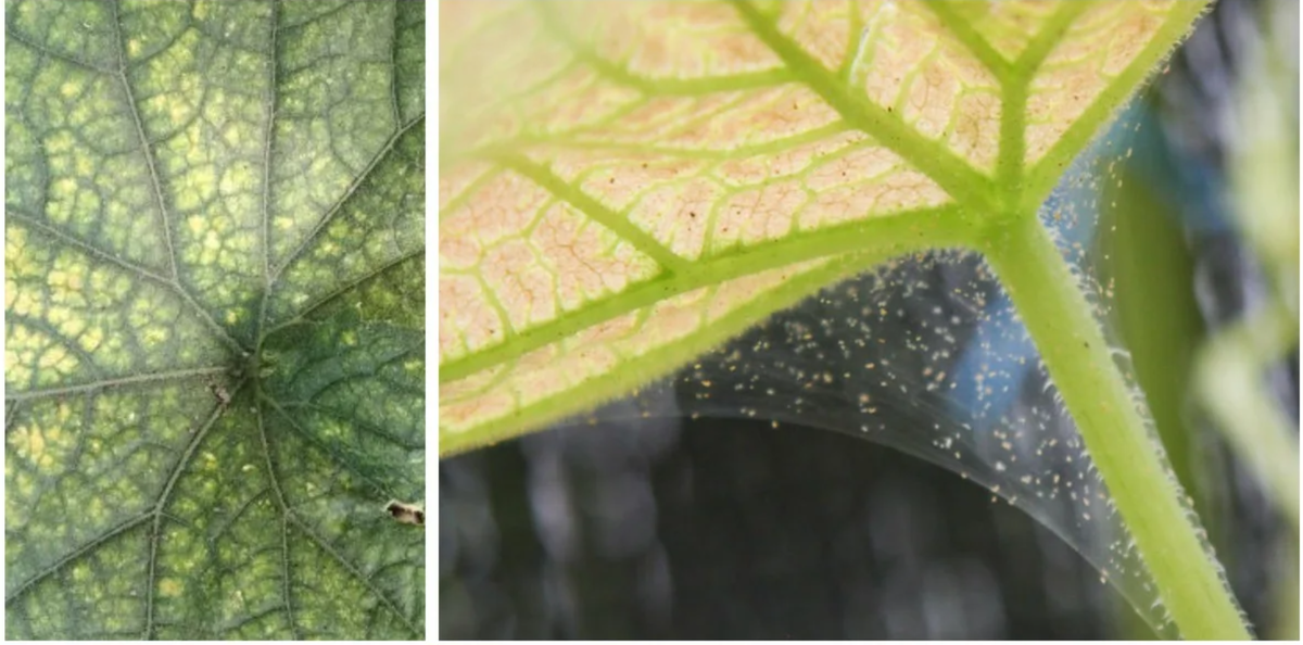 * Признаки: Мелкие светлые точки на верхней стороне листьев, которые со временем желтеют, буреют и усыхают. На нижней стороне листьев и между ними появляется тонкая паутинка. Заметить самого клеща (около 0,5 мм) очень трудно без лупы. Чаще всего появляется в сухую, жаркую погоду, особенно в теплицах.