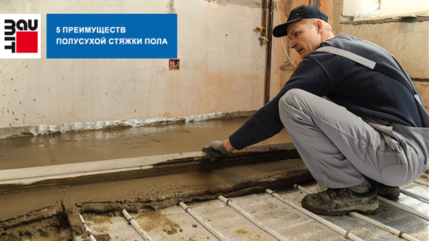 При масштабном ремонте в коммерческом, производственном или жилом помещении практически всегда приходится выполнять выравнивание полов. Широко используются наливные полы, способные самостоятельно выравниваться и формировать качественную гладкую поверхность. Но этот вариант, хотя и популярен, но имеет некоторые ограничения в использовании. В новой статье на канале Baumit Russia подробнее познакомимся с преимуществами полусухих стяжек для выравнивания полов. В тему: Какой материал выбрать для выравнивания пола? Составы сухих смесей для приготовления полусухих стяжек и наливных полов очень похожи. Главное отличие полусухих стяжек — очень низкое содержание воды в растворе, достаточное лишь для гидратации цемента. Эта особенность и формирует преимущества полусухой технологии. Основные особенности полусухой стяжки пола: 1. Минимальное содержание воды в растворе обеспечивает быстрое высыхание и сокращает время выполнения работ на объекте по сравнению с наливным полом. А низкое содержание воды