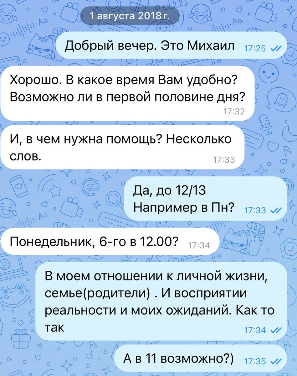 Время прощаться 1️⃣С января этого года я переодически крутил мысль о том, что я хочу закончить работу со своим психологом. Мы иногда обсуждали это на сессиях. После операции все встало на свои места. Я решил, что пора. Точка невозврата пройдена и пора прощаться. 2️⃣Пора прощаться не потому что мой психолог что-то сделала не так или она плохой специалист, а потому что я взял у нее все что мог взять за эти 7 лет и решил свой запрос (на фото)! Для меня это как закончить школу и начать подготовку к поступлению в ВУЗ. Да, по роду своей деятельности я буду искать себе нового специалиста, но пока время горевать и оплакивать потерю. 3️⃣В это воскресенье, скорее всего, у нас будет последняя 236 сессия. 4️⃣В преддверии этого я решил перечитать нашу переписку с психологом. Каким же я ужасным был клиентом первые два года и как я скептически относился к терапии: 🙃я мог отменить сессию за час до встречи, потому что проспал или просто не хотел вылазить из кроватки 🙃вечно переносил или отменял