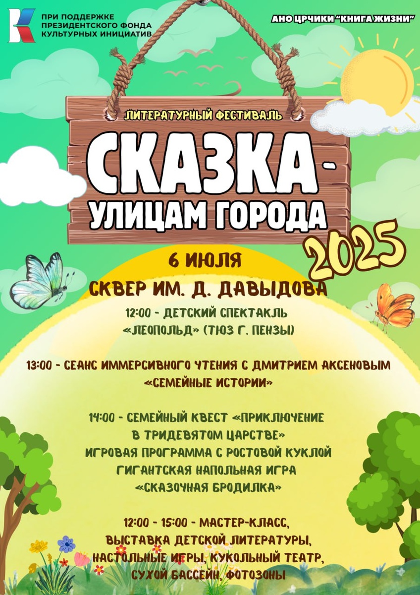 📚Сказка снова в городе! 6 июля — пятый день фестиваля «Сказка — улицам города. 2025» в сквере им. Д. Давыдова! 🌟 В программе: 🕛 12:00 — спектакль «Леопольд» (ТЮЗ Пензы) 📖 13:00 — иммерсивное чтение с Дмитрием Аксеновым 🗺 14:00 — семейный квест, шоу с ростовой куклой и премьера: 🎲 Гигантская напольная игра "Сказочная бродилка"! 🎨 С 12:00 до 15:00 — мастер-классы, игры, выставки, кукольный театр, фотозоны и сухой бассейн! Приходите всей семьёй — будет волшебно! Подробнее! #СказкаУлицамГорода #Пенза2025 #КнигаЖизни #ЛетоСКнигой