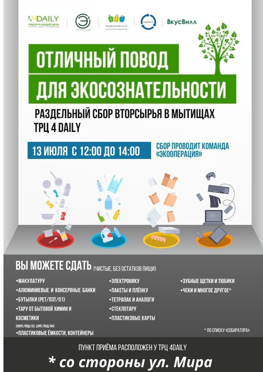 13 июля в Мытищах пройдет акция по раздельному сбору вторсырья🥳