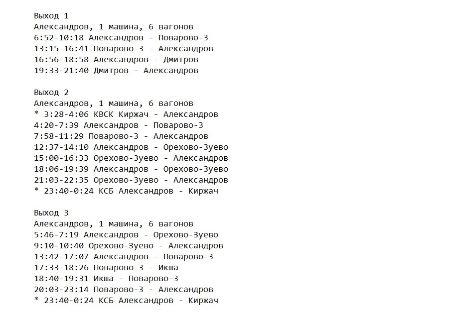 Итак, начнём с выпусков электричек на БМО. Оборот депо Александров (ТЧ-12, участок Поварово-3 - Александров - Куровская) выглядит вот так: