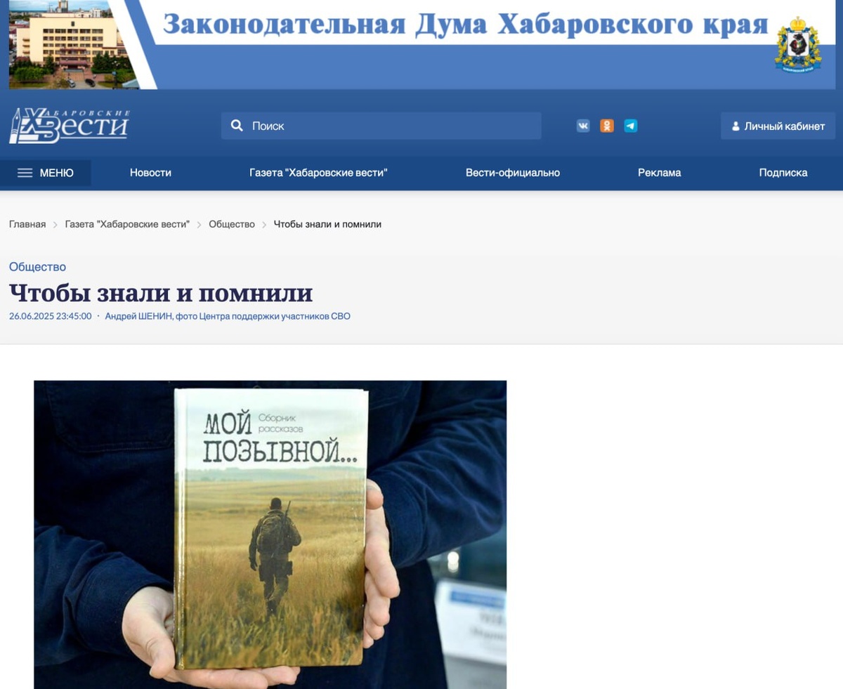 «Мой позывной...» — сборник рассказов от тех, кто сегодня защищает нашу Родину на передовой и в тылу Законодательная Дума Хабаровского края опубликовала на своем официальном сайте статью, посвященную сборнику рассказов «Мой позывной...», созданному при поддержке Фонда Марии Михайловой. «Позывной — это военное имя, по которому обращаются к участнику боевых действий. Часто его выбирают по тому, что человек делал и совершал, по чертам его характера. «Мой позывной...» — это сборник рассказов от тех, кто сегодня защищает нашу Родину на передовой и в тылу. Его авторы — российские бойцы, их родственники и близкие, волонтеры — все те, кто стал реальным свидетелем происходящих на СВО событий», — сообщается на сайте. Авторы напомнили слова Марии Михайловой о том, что книга не описывает боевые действия, а рассказывает о чувствах тех, кто в них участвует. Также они привели и другие мнения о сборнике. «Сборник рассказов "Мой позывной..." — отличный пример современной "лейтенантской прозы", счит