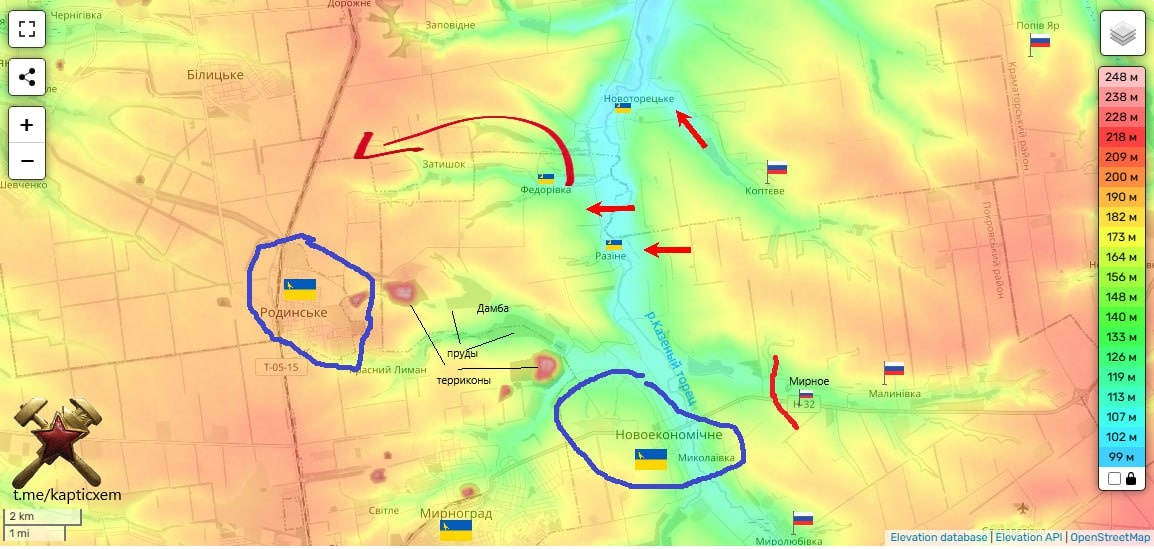 Наши сейчас штурмуют Разино и Новоторецкое, есть вклинивание по лесополосе между Разино и Федоровкой. Предполагаю, что будут обходить эту техногенную крепость перед Родинское с севера через овраги и балки