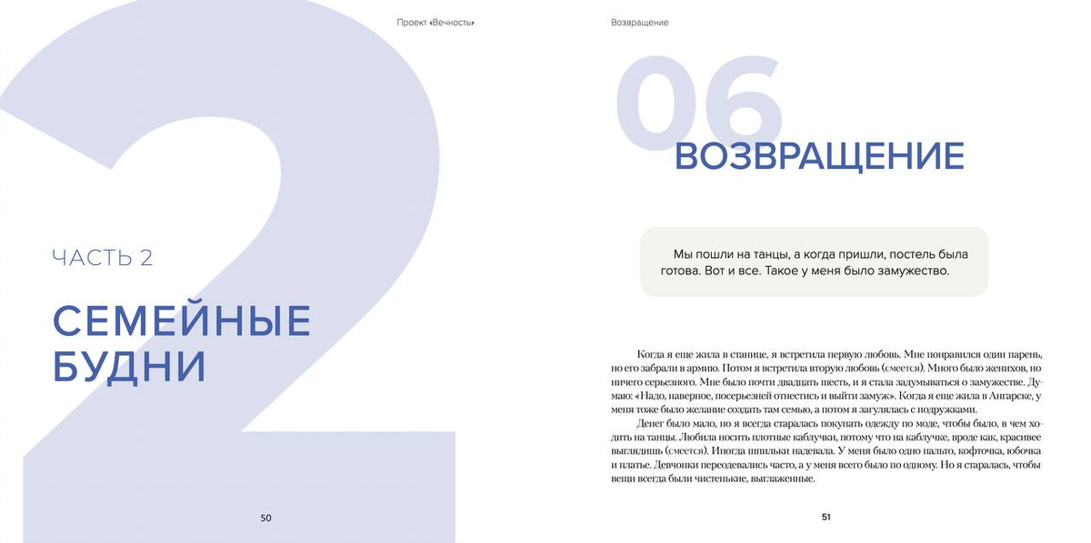 Мы все ее говорим: «Сделаю, когда будет время». Позвонить бабушке, навестить родителей, записать истории, которые они рассказывают за чаем. Мы искренне хотим, просто сейчас — не получается. И кажется, что время еще будет, но его может не хватить. У мужа Яны Бескровной, основательницы проекта «Вечность», был прадедушка. Настоящий рассказчик, он с теплом и деталями вспоминал, как оказался на Кубани во время Второй мировой войны, как строили мосты, как возвращались домой. Они подумали: надо бы сделать книгу и подарить на юбилей, только времени, как всегда, не было, они не успели. Поэтому первой книгой в проекте «Вечность» стала история бабушки Яны. Она согласилась на интервью, и за несколько встреч раскрылось то, что раньше ускользало: детство после войны, первая работа, любовь, семья, рецепты, традиции. В процессе они не просто записали биографию — они стали ближе. Это и есть цель проекта: сделать так, чтобы вы не пожалели о несказанном. Если вы это читаете — возможно, вы уже ощущаете тр