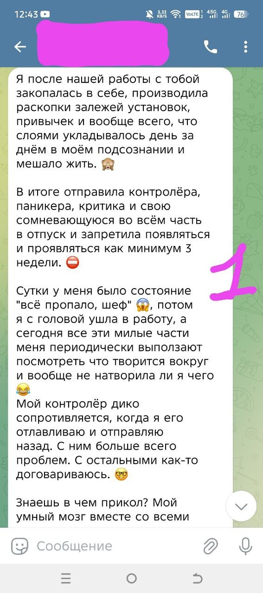Рефлексия в виде отзыва Обожаю вас 😍 Контролёр очень важен и нужен. Без него мы бегали бы по дорогам, выходили бы в окна, лезли бы в розетку Но когда он переходит грани и не даёт креативности, возможности проверит и рулит всей жизнью. Его лучше занять важным делом (находит креативные идеи или подтверждения, что может быть и по-другому) или отправить в отпуск (это сложнее) Благодарю, за отзыв 🙏 Работа с собой идёт не только во время созвана со специалистом, но большая часть проработки происходит до и после встречи 😉 Меняется фокус внимания и восприятия 👩❤️👨 Люблю❤️ Обнимаю🤗