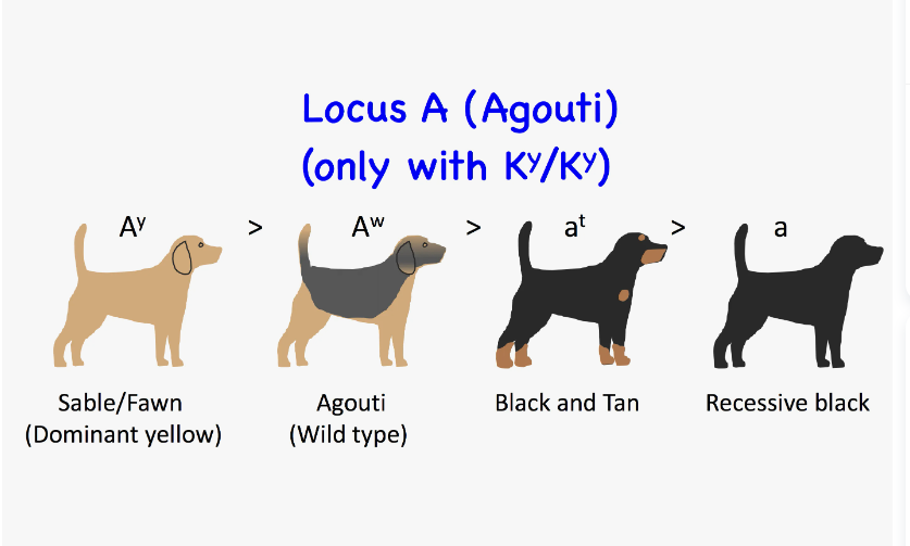 Важность этих двух серий аллелей будет показана в данной статье. Обе серии контролируют распределение черного и желтого пигментов по шерсти у большинства пород собак. Во взаимодействии эти локусы образуют множество хорошо известных окрасов.