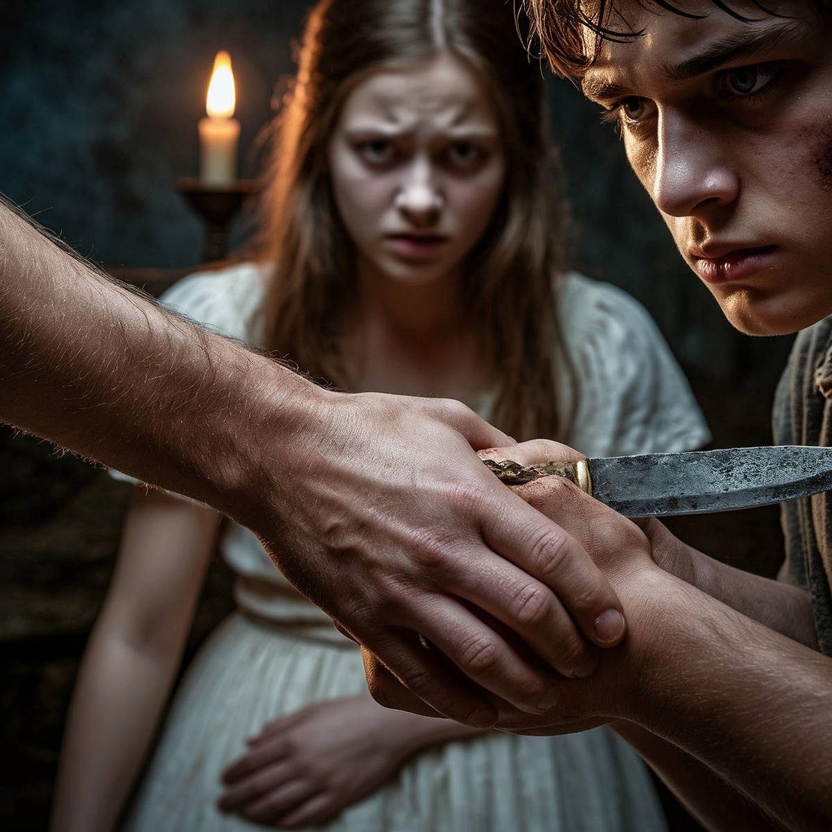 Я осторожно выглянула из-за кустов. В тусклом свете лампы я увидела, как Отец протягивает моему брату нож. Это был не просто нож. Длинный, узкий, из тусклого, будто пористого камня, с рукоятью из потемневшего дерева, покрытой незнакомыми мне символами. Миша взял его. Он держал нож с благоговением, почти с нежностью.