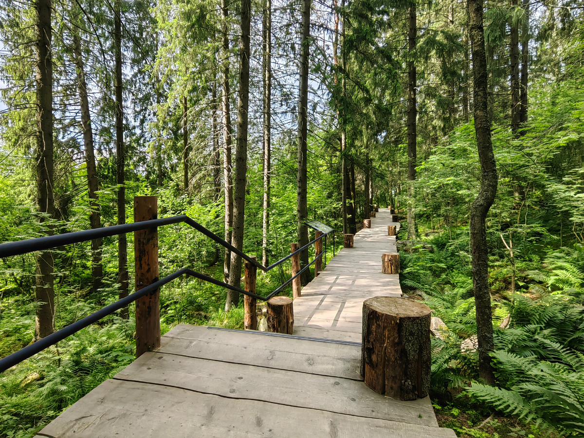 Недавно узнал, что в Сортавале есть живописная экотропа со смотровой площадкой, которая находится на горе Паасо. Из центра города туда можно добраться на автобусе номер 1 минут за 15. Поэтому во время однодневной поездки из Петербурга (4 часа на "Ласточке") мы решили непременно её посетить, потому что по городу ранее уже гуляли. Привлекательность этого места заключается ещё и в том, что под горой проходит железная дорога, по которой курсирует ретро-поезд "Рускеальский экспресс". С возвышенности открываются красивые виды на неё и поезд. Имеется расписание. Но мы находились на вершине в тот момент, когда до следующего поезда было много времени. В связи с чем ждать не стали. Маршрут же по деревянным настилам со ступенями начинается у подножия горы Паасонвуори (сокращённо Паасо) и по одному склону ведёт на её вершину (79,2 м), а по другому (северному склону) спускается обратно к выходу. Общая протяжённость составляет, примерно, 1 км. Вечером на трассе включается художественная подсветка (м