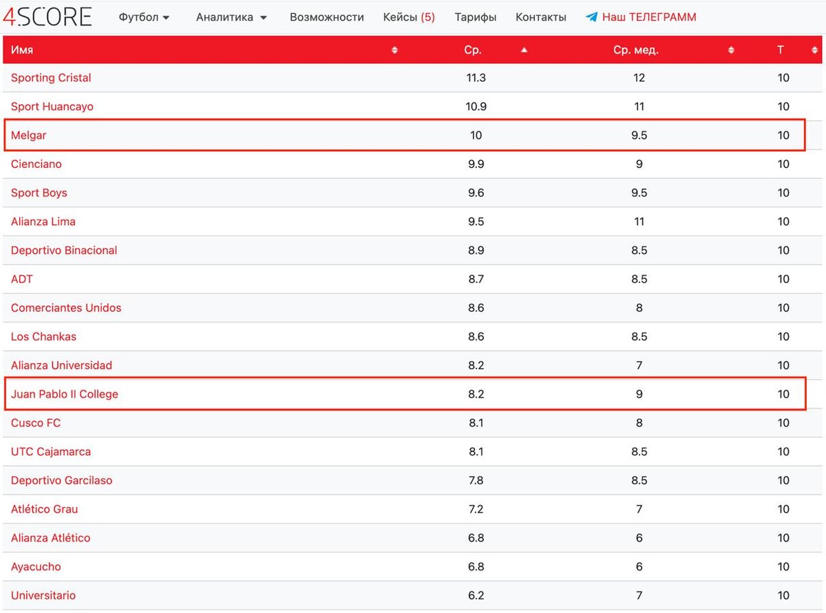 🇵🇪Перу. Премьера Дивизион ⚽️Juan Pablo II College - Melgar⚽️ 👉Бук даёт УГЛОВЫЕ от 8.5, предлагаю посмотреть по инструментам-ТМ или ТБ... 🤓Обратимся к РЕЙТИНГУ КОМАНД, имеем по двум командам 8.2 и 10. Ну тут точно уже не ТМ 🧐Посмотрев на игры обеих команд, видим, что подают довольно много, очень редко есть индивидуальные по 0-2, что конечно опускает общее среднее 🌟Мой прогноз ТБ8.5. Хату не грузим, но присмотреться стоит