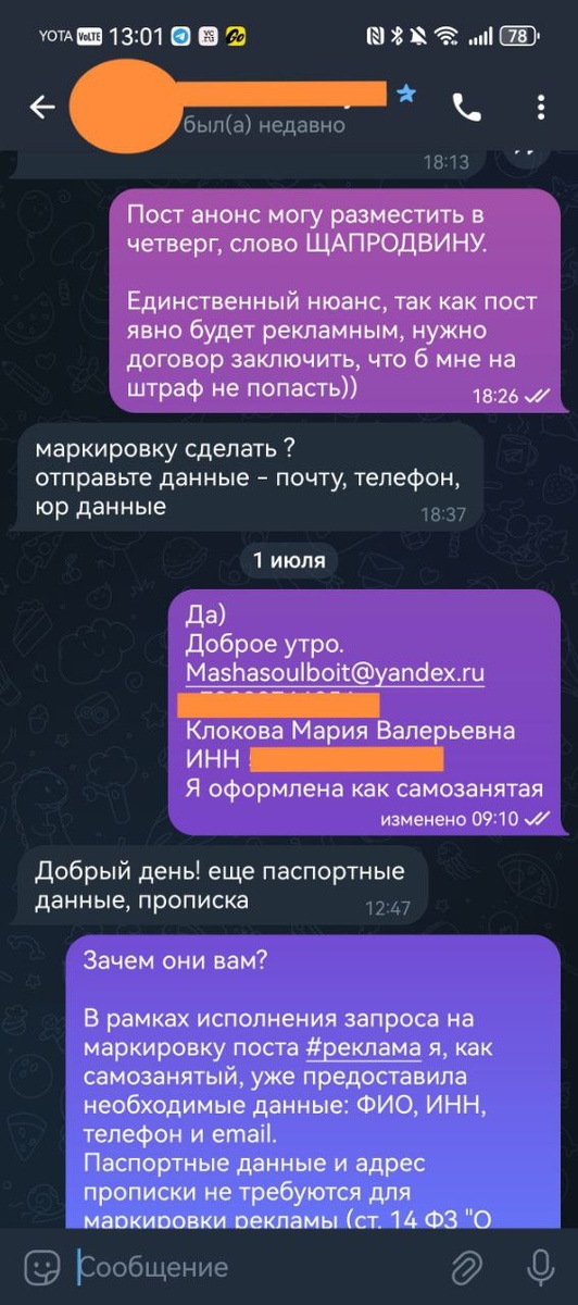 📌 Юридический ликбез для самозанятых: «Когда требование паспорта — необоснованно». Недавно при размещении поста рекламного столкнулась с курьёзной ситуацией: после предоставления ФИО и ИНН заказчик запросил паспортные данные и прописку для договора. Почему это проблемно: 1. ▪️ Для договора с самозанятым достаточно ФИО + ИНН (ст. 4 ФЗ №422-1). 2. ▪️ Паспорт/прописка: - Не влияют на исполнение обязательств; - Не требуются для налоговой отчётности; - Нарушают принцип соразмерности (ст. 5 ФЗ №152). Как я решила ситуацию: 1. Письменно пояснила необязательность этих данных. 2. При сохранении требований — отказалась от сотрудничества. Важно помнить: ЗАПРОС ПАСПОРТА → ❶ «Пожалуйста, обоснуйте необходимость» → ❷ «Отправляю ИНН — этого достаточно» → ❸ «Без письменного согласия на обработку ПДн и веских причин передать данные не могу» Чисто предостережение для вас ❤️ Сталкивались с чрезмерными требованиями заказчиков? Делитесь историями! #персональныеданные #фриланс #маркировка