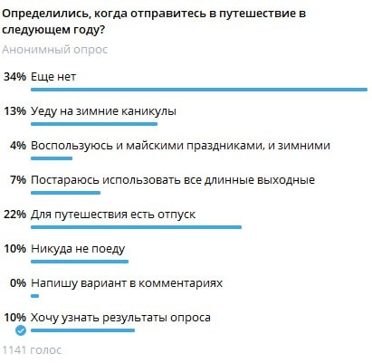 В ответ на пост Еще не все успели сходить в отпуск в 2025-м, но, как показывает опрос Крыши ТурДома, с планами на отдых в 2026-м половина наших подписчиков уже определилась. Причем многие предпочитают не смотреть на календарь длинных выходных от Минтруда. Он каждый год непредсказуем из-за переносов то с гендерных праздников на май, то, наоборот, вообще на зиму. 22% используют для путешествий отпуск – так еще и выгоднее, чем привязываться к общим датам. Плюсы долгосрочного планирования, пишете вы, очевидны: возможность маневра, а также вариант «размазать расходы» на несколько месяцев, найти свободные места и интересные предложения в хороших отелях. Треть участников голосования пока что путешествия в 2026 году конкретно не запланировали. А 10% вообще никуда не поедут. Подробнее написали на ТурДоме. @tourdom