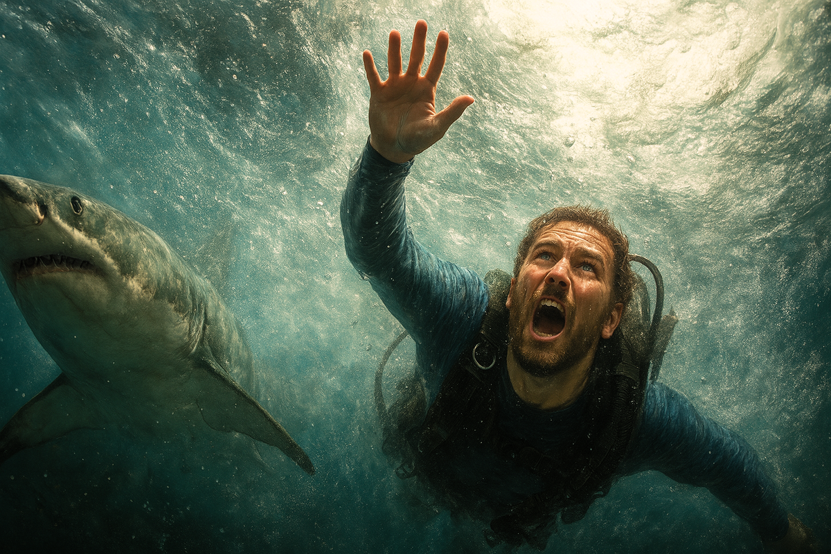 Всё происходило как в замедленной съёмке. Сначала он не чувствовал боли, только давление: грудная клетка, спина, руки, будто невидимый пресс давил со всех сторон. Он не мог дышать. Он не мог пошевелиться. Только когда попытался вырваться и рука попала в пасть акулы, пришла боль. Она была такой яркой, что заслонила страх.