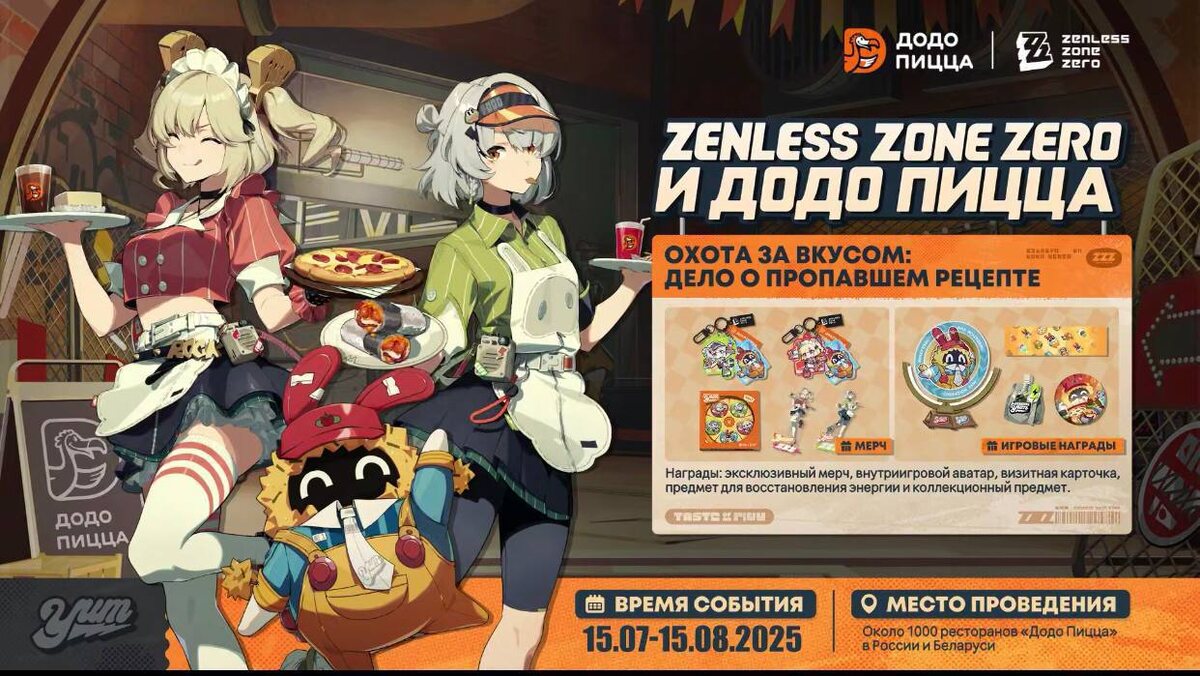 «Додо Пицце капец». Коллабу Додо с игрой Zenless Zone Zero официально анонсировали! Создатели игры ZZZ показали мерч и мини-мультфильм: Скоро коллаборация с Додо Пицца, а секретный рецепт пропал! Энби и Бёрнис берутся за расследование и готовы принять участие в Охоте за вкусом! Благодарим Додо Пиццу за чудесное видео! Судя по всему, нас ждут брелоки и фигурки с персонажами игры, фирменная коробка для пиццы и внутриигровые плюшки. Геймеры получат аватар, визитную карточку, мерч, предмет для восстановления энергии и коллекционный предмет прямо в Zenless Zone Zero. Сотрудники Додо, крепитесь!