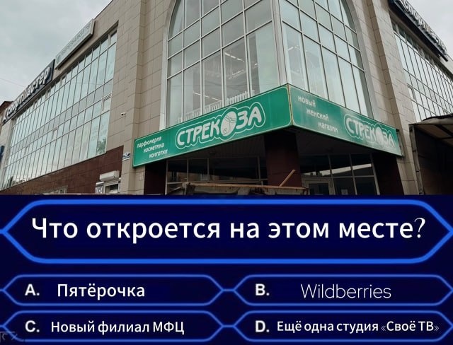 Что на месте «Стрекозы» появится теперь? ❓❓❓ Магазин косметики и бытовой химии «Впрок» на днях закрылся. До этого много лет здесь находилась «Стрекоза». И совсем скоро на этом месте появится новый арендатор. 👀 Как вы думаете - что планируется разместить на этих площадях? Журналистам Своё ТВ сегодня стали известны подробности. А вот сможете ли догадаться вы? Проверим интуицию? 🟦 Ваш вариант: A. Пятёрочка B. Wildberries C. Новый филиал МФЦ в Березниках D. Ещё одна студия «Своё ТВ» — будем расширяться 💬 Пишите свой ответ в комментариях — посмотрим, чья интуиция безошибочна 😉А уже завтра мы дадим правильный ответ! 👉 Подписаться на Своё ТВ 👉 Прислать новоость