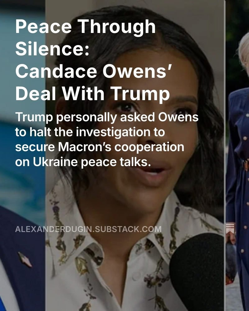 Peace Through Silence: Candace Owens’ Deal With Trump Trump personally asked Owens to halt the investigation to secure Macron’s cooperation on Ukraine peace talks. Read the article here: https://alexanderdugin.substack.com/p/peace-through-silence-candace-owens