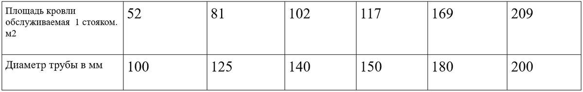 Из этого следует, что площадь кровли, приходящаяся на один стояк, и диаметр водосточной трубы находятся в зависимости. Для простоты мы уже посчитали эти величины и приводим их в таблице.