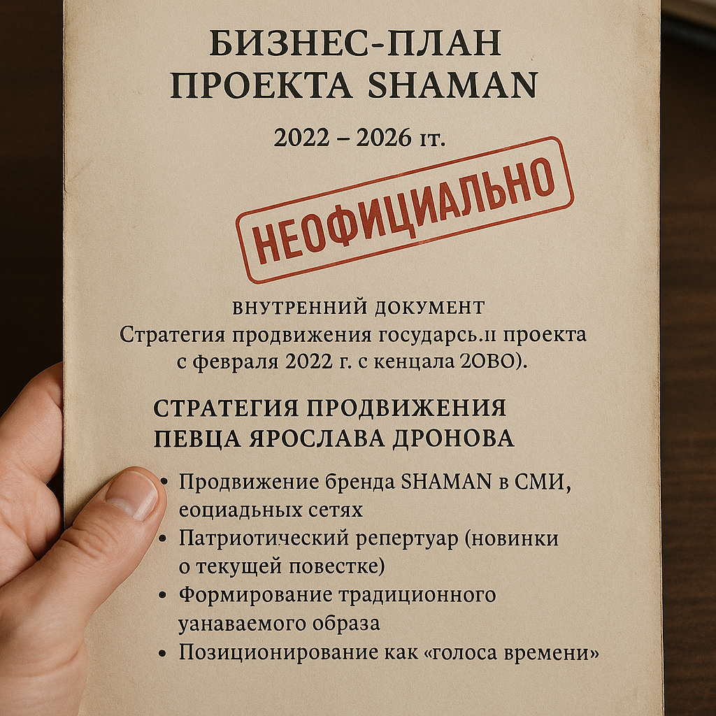 На днях в сеть якобы попал внутренний бизнес-план проекта SHAMAN, охватывающий период с начала СВО и вплоть до конца 2026 года. Документ — неофициальный, с неясными источниками, но с пугающей чёткостью описывает стратегию продвижения певца Ярослава Дронова как государственного культурного проекта. Если это утечка правдива хотя бы на 50%, мы имеем дело не с артистом, а с тщательно сконструированным медиапродуктом. Причём не просто для сцены — а для формирования образа времени. Что именно в этом бизнес-плане? По данным источников, план включает: И главное: план завершается в 2026 году, после чего образ SHAMAN должен быть либо «переформатирован», либо «заморожен до следующего цикла». Это цитата. Если исходить из предположения, что бизнес-план реален, то становится ясно: речь идёт не об артисте как о свободной творческой единице. А о продукте, разработанном с определённой целью — создать эмоциональный якорь в сознании массовой аудитории в сложный исторический период. Всё в нём просчитано: