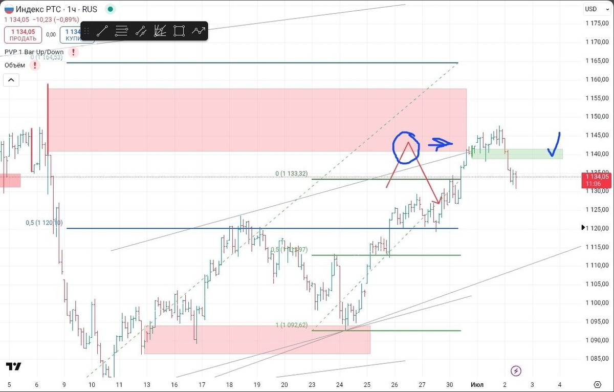 В ответ на пост График индекса РТС, возобновлние от уровня продаж и выхода в перекупленость. Возможен/вероятен обратный тест продавленного покупателя. Модель на рост еще в работе. Не ИИР