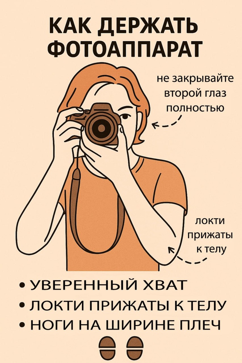Продолжаем рассказывать простые истины фотографии. Вы удивитесь, но очень многие, кто давно снимает, до сих пор не знают, как правильно держать фотоаппарат. А потом удивляются: «Почему у меня всё не в резкости?», «Почему кадры смазаны?», «Почему техника вроде норм, а результат — не очень?» А всё просто: иногда достаточно немного поправить базу, и фото сразу становятся заметно лучше. 📸 Как правильно держать фотоаппарат? Указательный палец правой руки — на спуске, большой палец сзади. Камеру держим уверенно, но без фанатизма. Не жмём кнопки случайно. Проверяем, не перекрыли ли пальцами датчики, если камера более старая или включен ли стабилизатор если новая? Левая рука поддерживает камеру снизу или объектив, если он сменный. Особенно у зеркалок — вес всё-таки серьёзный, одной рукой не удержишь. Удобнее всего прижать локти к корпусу — создаём из себя живой штатив. 🚶♀️ А что с ногами? Не в шутку, а всерьёз: стойка фотографа важна. Поставьте ноги на ширину плеч, уверенно и стабильн