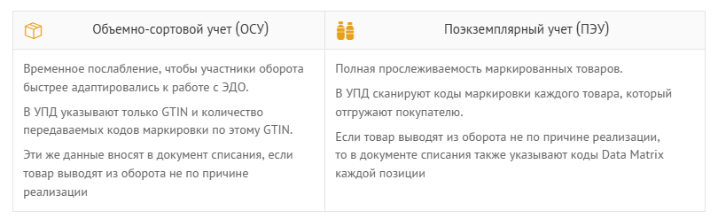 Поэкземплярный учет — обязательное условие для всех маркированных товаров. На него предстоит перейти всем участникам оборота. Для отдельных товарных групп предусмотрен еще объемно‑сортовой и партионный форматы.