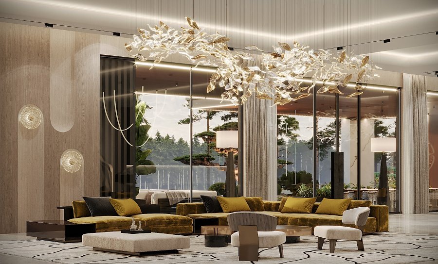 В интерьерах класса люкс светильники часто играют роль арт-объектов. Так что неудивительно, что центральная люстра в этом проекте выглядит как стая птиц. На длинных невидимых тросах зафиксированы сотни стеклянных подвесок, создающие эффект подвижного каскада.