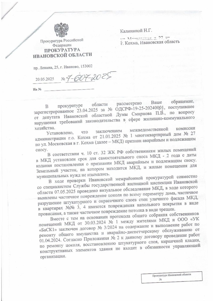✔️Коммунисты помогли жительнице Кохмы добиться ремонта аварийной стены В Народную приемную КПРФ обратилась жительница города Кохма с жалобой на опасное состояние своего дома. Женщина рассказала, что стена в ее многоквартирном доме по ул. Московская начала разрушаться, а переселение, по официальным данным, ожидается лишь через 3–4 года. Жильцы опасались за свою безопасность и даже боялись спать в собственных квартирах. Депутат Ивановской областной Думы от КПРФ Павел Смирнов подготовил официальный запрос в надзорные органы. В ответе прокуратуры Ивановской области от 20 мая 2025 года подтвердилось, что дом № 27 по ул. Московская признан аварийным еще в январе 2025 года, однако необходимые меры по ремонту или расселению не принимались. Проверка выявила серьезные повреждения: разрушение цоколя, трещины в стенах, провисание полов и потолков в квартирах. Прокуратура указала на бездействие администрации Кохмы и потребовала устранить нарушения. Благодаря вмешательству коммунистов ситуация сд