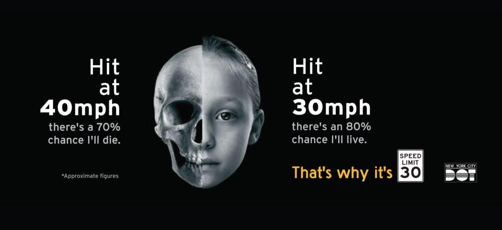 Помните, я говорил, что оптимальная скорость в городе – 50 км в час? Вот нью-йоркский плакат, который объясняет, почему в городе действует ограничение скорости 30 миль/час, или 48 км/ч.