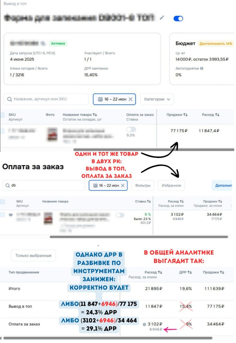 Расход (оплата за заказ) 3 102 руб., продажи 34 464 руб., ДРР 9% ❗️ Подвох в том, что расход за клики разнесен в две статистики: