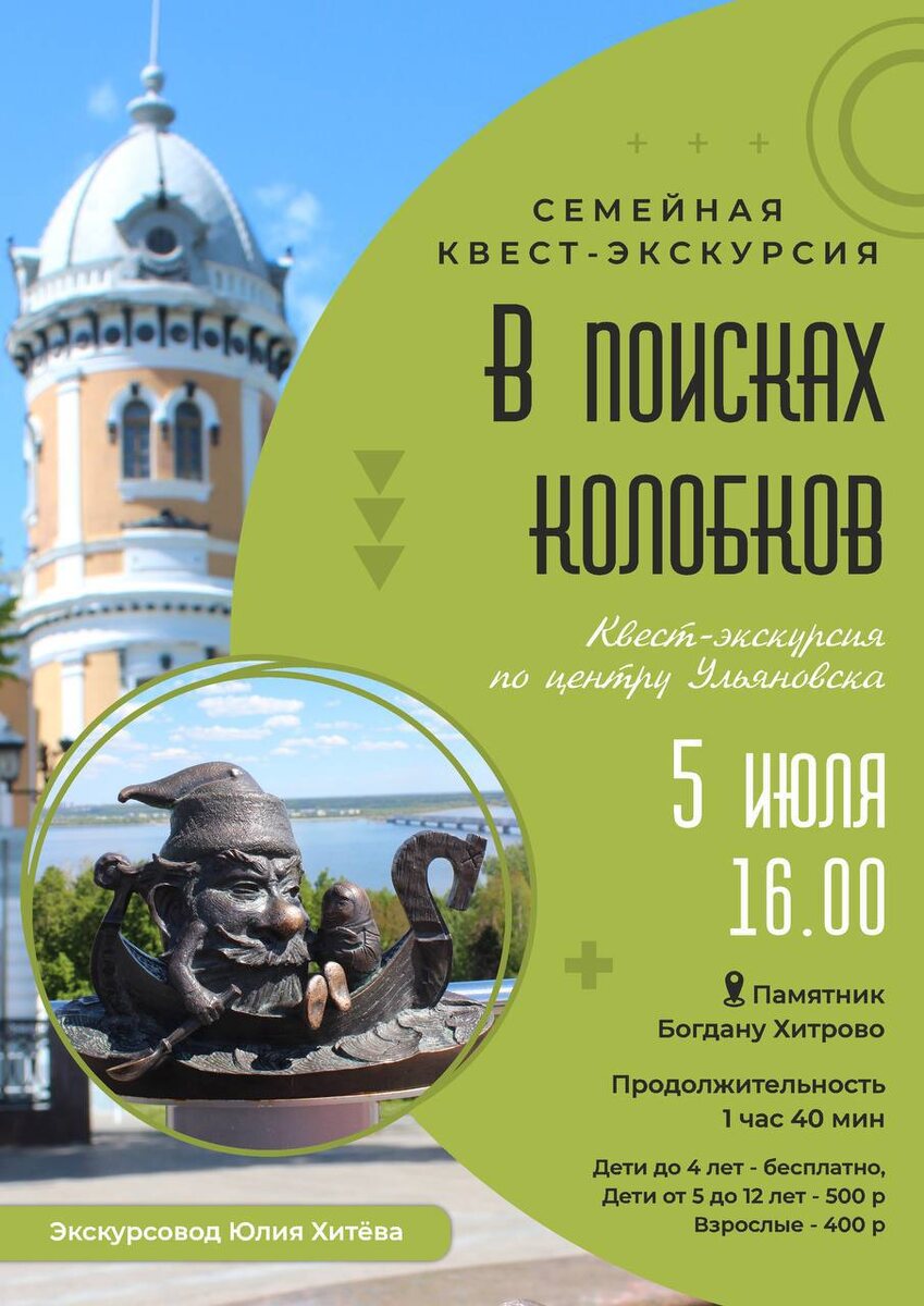 Семейный квест «В поисках колобков» 🗓️ 5 июля 16.00 📍памятник Богдану Хитрово В центре города спрятались 8 колобков - каждый откроет вам тайну Симбирска-Ульяновска. Будете: ✔ Искать веселых Колобков! ✔ Узнавать историю города ✔ Любоваться старинной архитектурой ✔Знакомиться с великими земляками ✔ Разгадывать шифры и загадки! Продолжительность: 1 час 40 мин 🏷️ дети до 4 лет бесплатно, от 5 до 12 лет - 500₽., взрослые - 400₽ Запись и подробная информация у @kitnuf10 #5июля25