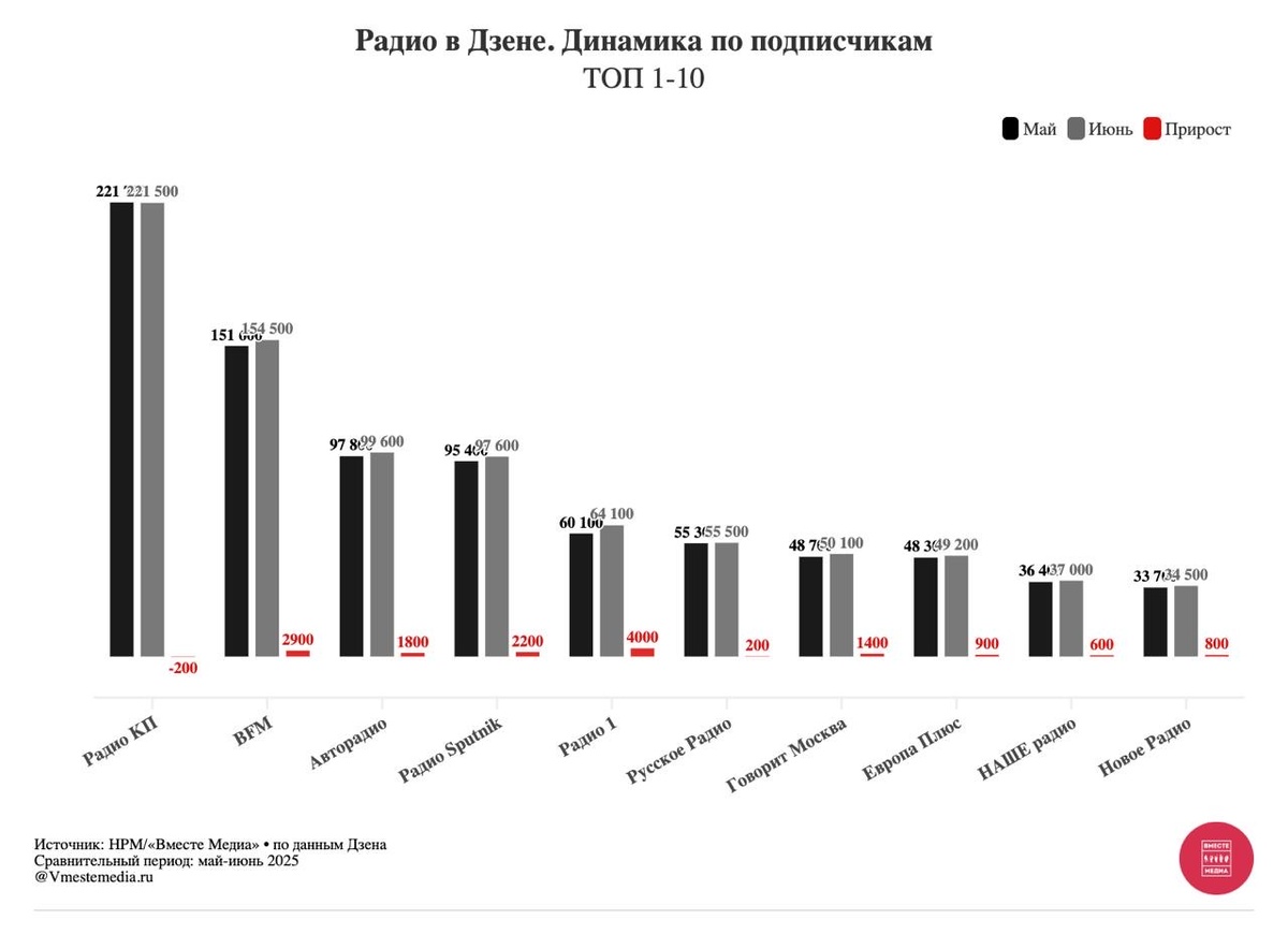 Динамика радиостанций по подписчикам (Май - июнь 2025) ➡️ Радио КП (221,5К) — продолжает оставаться лидером по числу подписчиков и единственным радио в категории >200К ➡️ BFM (154,5К) — единственное радио в категории >100К с высоким приростом подписчиков за июнь 📈+2,9К ➡️ Авторадио (99,6К) — с учетом активного привлечения подписчиков уже в следующем месяце перейдет в категорию >100К ➡️ Радио Sputnik (97,6К) — также в ближайшие месяцы с большой вероятностью перейдет в категорию >100К ➡️ В категорию >50К в июне вошла радиостанция Говорит Москва (50,1К) и присоединилась к Авторадио (99,6К), Радио Sputnik (97,6К), Радио 1 (64,1К) и Русское Радио (55,5К). ➡️ Европа Плюс (49,2) также имеет большие шансы в ближайшие месяцы перейти в категорию >50К, если сохранит активный прирост подписчиков, аналогичный прошлому летнему сезону. ➡️ Радио 1 (64,1К) — лидирует по приросту подписчиков с июне 📈+4К ➡️ Радио 7 на семи холмах (8234) — поднимается на одну ступеньку рейтинга в июне (с 20 на 19 место)